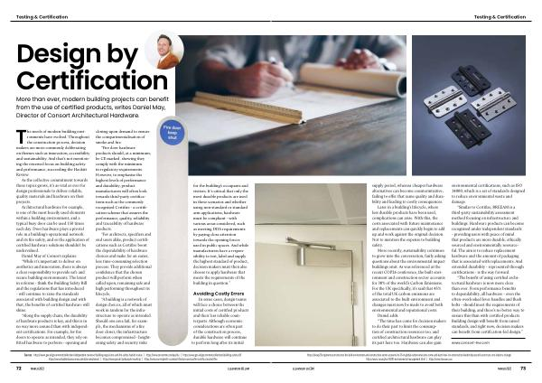 Architectural hardware for example , is one of the most heavily used elements within a building environment , and a typical busy door can be used 150 times each day . Door hardware plays a pivotal role in a building ’ s operational network and its fire safety , and so the application of certified hardware solutions shouldn ’ t be undervalued . Daniel May of Consort explains : “ While it ’ s important to deliver on aesthetics and innovation , there is always a clear responsibility to provide safe and secure building environments . The latest in reforms - think the Building Safety Bill and the regulations that has introduced - will continue to raise the standards associated with building design and with that , the benefits of certified hardware will shine .