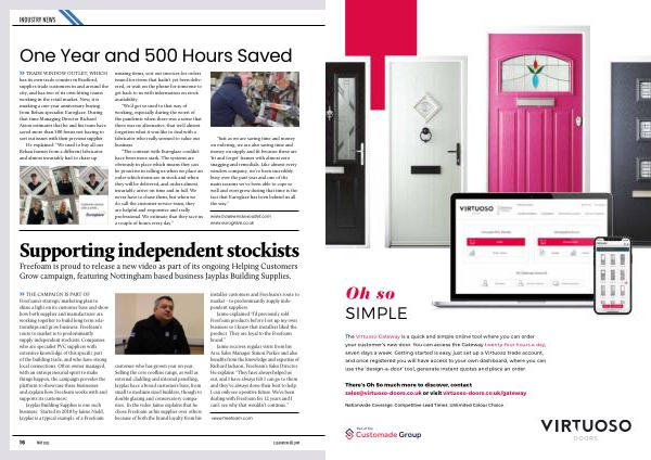 » TRADE WINDOW OUTLET , WHICH has its own trade counter in Bradford , supplies trade customers in and around the city , and has two of its own fitting teams working in the retail market . Now , it is marking a one-year anniversary buying from Rehau specialist Euroglaze . During that time Managing Director Richard Aston estimates that he and his team have saved more than 500 hours not having to sort out issues with their previous supplier .