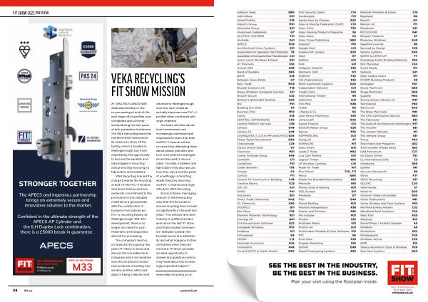 FITSHOW . CO . UK 2022 NEC BIRMINGHAM 10-12 MAY 2022 Addison Saws Q60 AdminBase D31 Allied Profiles E19 Allports Group M51 Allumette Group E21 Aluminium Federation Q7 ALUTECH SYSTEMS F31 Alutrade D41 APECS M33 Architectural Vision Systems E31 Association for Specialist Fire Protection T6 Association of Composite Door Manufacturers C21 Aston Lynch Windows & Doors D51 AT Precision S55 Avocet ABS Q39 Band of Builders N65 Bel ' M G19 Between Glass Blinds H7 Betz Trade M43 Blusafe Solutions UK F18 Bossy Windows Hardware Solution S51 Brisant-Secure G32 Britmet Lightweight Roofing H20 BSI P51 Building Our Skills R7 Business Pilot M10 Carlac D18 CENTRAL EXTRUSIONS C30 Central Platform Services S39 Certass D49 Certass TA D49 CHANGZHOU C . C . H . H . IMP and EXP . CO Q34 Chase Taylor Recruitment Q50 Checkatrade C29 Classic British Slate G7 Clearview M31 Comar Parkside Group B49 Combilift C11 CompDoor F51 Cooke Brothers T56 Corpay C4 Cortizo F11 Council for Aluminium in Building C49 Creative Resins E23 CRL UK A51 DAKO P41 Decorcera B31 Direct Trade ( Yorkshire ) M42 DL Chemicals H50 DOORCO Q11 Eko-Okna F52 Element Materials Technology B21 Emmegi UK Q41 EvA Fenestration Software B22 Everglade Windows M10 Exlabesa K11 Extrudaseal G6 FENSA C12 Fentrade Aluminum N34 Finnsworth N49 Force 8 ( EOT ) & Clarke Nicklin M50 Fort Security Doors C14 Gardengate F21 Gerda Door by Pioneer R20 Glass & Glazing Federation ( GGF ) C10 Glass Films T30 Glass Glazing Products Magazine S6 Glass News C5 Glass Times Publishing N60 Glazpart P61 Google Nest K41 Gowercroft Joinery E20 GQA R7 Haffner H21 Hird S21 Hodgson Sealants S59 Hörmann ( UK ) S11 HUBTEX F42 ICB ( Fabrications ) E32 IKON Aluminium Systems D20 Independent Network K21 Insight Data D61 International Timber R8 Internorm G41 ITALMAC N38 iX250 R6 J Banks & Co E6 John Penny Machinery S49 Joinerysoft E40 Kanda Finance E12 KDOOR / Rebar Group G28 Kencar P30 KÖMMERLING D21 Konig UK P7 KORNICHE N11 Kubu Smart Q31 Leads 2 Trade M52 Liva Cam Makine G51 Logical Timber S60 LP Window Controls C41 Made for Trade N11 Maxi Mover T55 , T11 Mecal Q60 Media Hut Branded Merchandise S62 Metrotile R61 Morley Glass & Glazing N31 ODL Europe D11 Perdesan D7 PiGs D49 Planet Roofing M21 Plasfoils / Haogenplast R38 Pratley and Partners P66 Pro Installer M31 Prodim S35 Profinder Media E51 Profine UK D21 Profitmaker Window & Door Software P21 PST H6 Pure Vista P29 Purplex Marketing D61 QANW D49 Rapid Prototyping Systems R65 Rationel Windows & Doors C18 Regalead M6 Renolit G11 Renson UK P11 Robafoam K51 ROCKDOOR N41 Ronjack Products E7 Roseview Windows K49 Sapphire Louvres N6 Secured by Design C28 Selecta Systems K60 SERİM ALÜMİNYUM F7 Shandong Ambit Building Materials D55 SKS Monostar C34 Smart Ready H11 Sobinco G21 Solar Calibre Doors R11 STORM Building Products E9 Strongdor P47 Strutz Machinery Q59 Stuga Machinery Q59 Supalite M60 Taixing Sainty Industry Co M41 Technibond P60 Telluria UK R40 The Brass Man India M41 The CPD Certification Service N63 The Fabricator E51 The Guild of Architectural Ironmongers N71 The Installer E51 The Joinery Network M7 The Sempre Group S61 Timco P64 Total Fabricator Magazine Q32 Total Installer ( Media Now ) Q32 UAB Fenestrum C27 UK Doors Online F51 UL International ( UK ) C3 Ultraframe R59 Uplifter S41 Vacuum Glazing UK B8 VEKA K21 VEKA Recycling K21 VELFAC C20 Vello Nordic S7 Vertik-Al D20 Victorian Sliders ( Ecoslide ) R30 Vision Publications N61 Vorne Window and Door Systems M15 We Mind & Kelly Matters C32 Wendland Roof Solutions F50 West Port K59 Westtool E10 WinArtProje / Alu & Art Dergiler A9 WINBAG A8 Windoform D22 Windowparts F29 Windows Active C20 WPR E15 Yakaza Aluminium Door & Window P29 Zero Seal Systems Q20 SEE THE BEST IN THE INDUSTRY , BE THE BEST IN THE BUSINESS . Plan your visit using the floorplan inside .