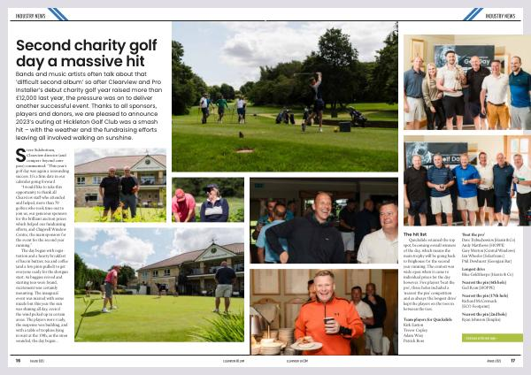 Bands and music artists often talk about that ‘ difficult second album ’ so after Clearview and Pro Installer ’ s debut charity golf year raised more than £ 12,000 last year , the pressure was on to deliver another successful event . Thanks to all sponsors , players and donors , we are pleased to announce 2023 ’ s outing at Hickleton Golf Club was a smash hit – with the weather and the fundraising efforts leaving all involved walking on sunshine .
