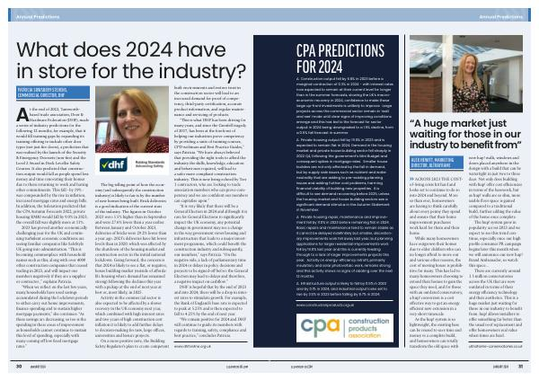 “ It is very likely that there will be a General Election in 2024 and although it is rare for General Elections to significantly impact the UK economy , any potential change in government may see a change in the way government views housing and infrastructure that leads to a major investment programme , which could benefit the construction industry and subsequently , our members ,” says Patricia . “ On the negative side , a lack of parliamentary time in 2024 or delays in policy decisions and projects to be signed-off before the General Election may lead to delays and therefore , a negative impact on cashflow .”