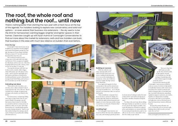 “ But more than that , with hup ! you really get the best of both worlds as this support extends to Ultraframe too ; the full package of marketing , sales and technical support straight from the source .” Clearview has teamed up with Connaught Conservatories in 2024 to work on a series of articles to help installers build their business with conservatory and solid roofs , extension systems and outdoor living products . From hints and tips , to product information , unpacking regulation jargon to customer case studies , together we will provide everything you need to add value to your business and make sure you ’ re at the forefront of what the homeowner wants in 2024 and beyond .