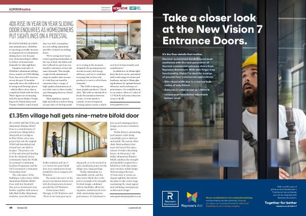 » NATIONWIDE ALUMINium manufacturer , Glideline , is reporting a notable increase in enquiries for its aluminium sliding doors over the past year , demonstrating its ability to deliver on homeowner demands for slim sightlines . Enquiries and sales of Glideline ’ s aluminium sliding doors , namely its GS20 Sliding Door , has seen a 40 % increase across the past 12 months , especially since the addition of its integrated flooring option – which offers a door that is completely flush with the floor . These figures are in keeping with the latest Market Trends Report by Windowbase and Tommy Trinder , which found |