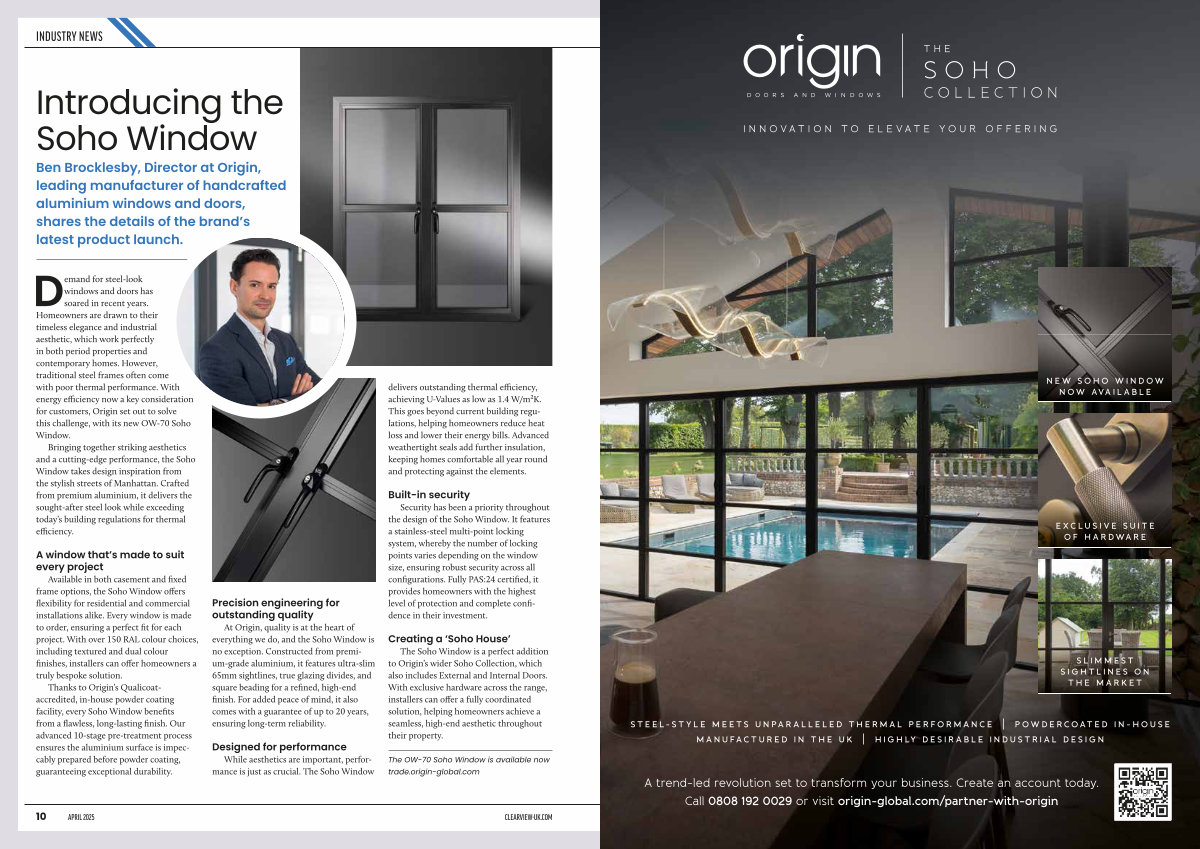 Ben Brocklesby, Director at Origin, leading manufacturer of handcrafted aluminium windows and doors, shares the details of the brand’ s latest product launch.