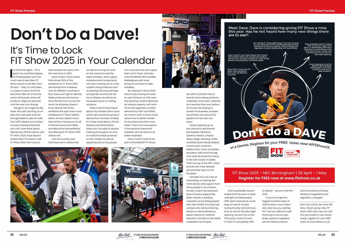 By missing FIT Show 2025 Dave is also turning his back on over 30 hours of CPD certified learning content delivered by industry experts, with technical and regulatory content delivered by GGF and FENSA. He mustn’ t want to know more about how to better market his business and drive more leads. That’ s one more space in the seminar theatre for installers who do want to do better business!