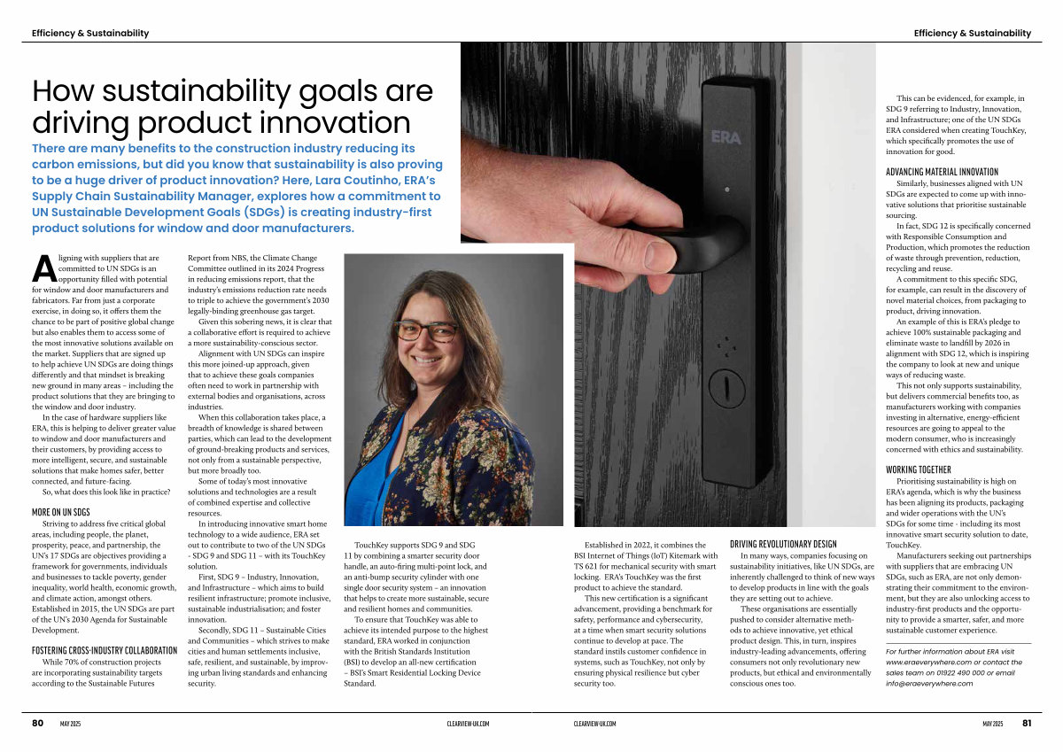 There are many benefits to the construction industry reducing its carbon emissions, but did you know that sustainability is also proving to be a huge driver of product innovation? Here, Lara Coutinho, ERA’ s Supply Chain Sustainability Manager, explores how a commitment to UN Sustainable Development Goals( SDGs) is creating industry-first product solutions for window and door manufacturers.