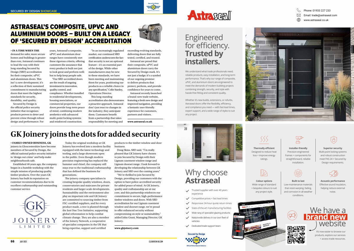 » IN A TIME WHEN THE demand for safer, more secure homes and buildings is greater than ever, Astraseal continues to lead the way with their long-standing Secured by Design( SBD) accreditation for their composite, uPVC and aluminium doors. This isn’ t a new development; it’ s a reflection of their sustained commitment to manufacturing doors that meet the highest standards for security, durability, and quality.