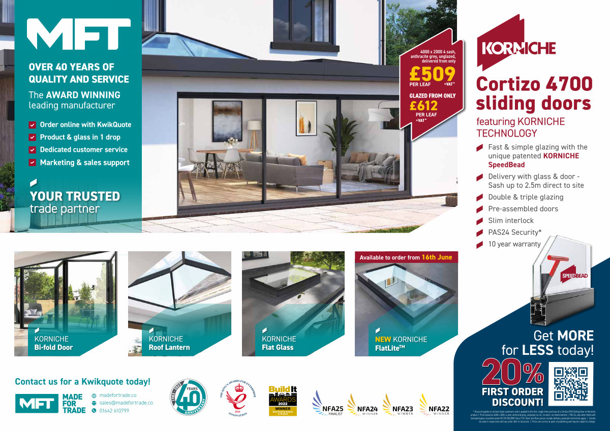 * Discount applies to all new trade customers and is applied to the first, single item purchase of a Cortizo 4700 Sliding Door or Korniche product | Price based on 4000 x 2000, 4 sash, anthracite grey, unglazed, no cill, no vents, no reinforcement. | PAS: 24, only when fitted with laminated glass classified under BS EN 356:2000 Class P1A | Door and Glass prices include delivery, postcode restrictions apply | Cannot be used in conjunction with any other offer or discounts | Prices are correct at point of publishing and may be subject to change.