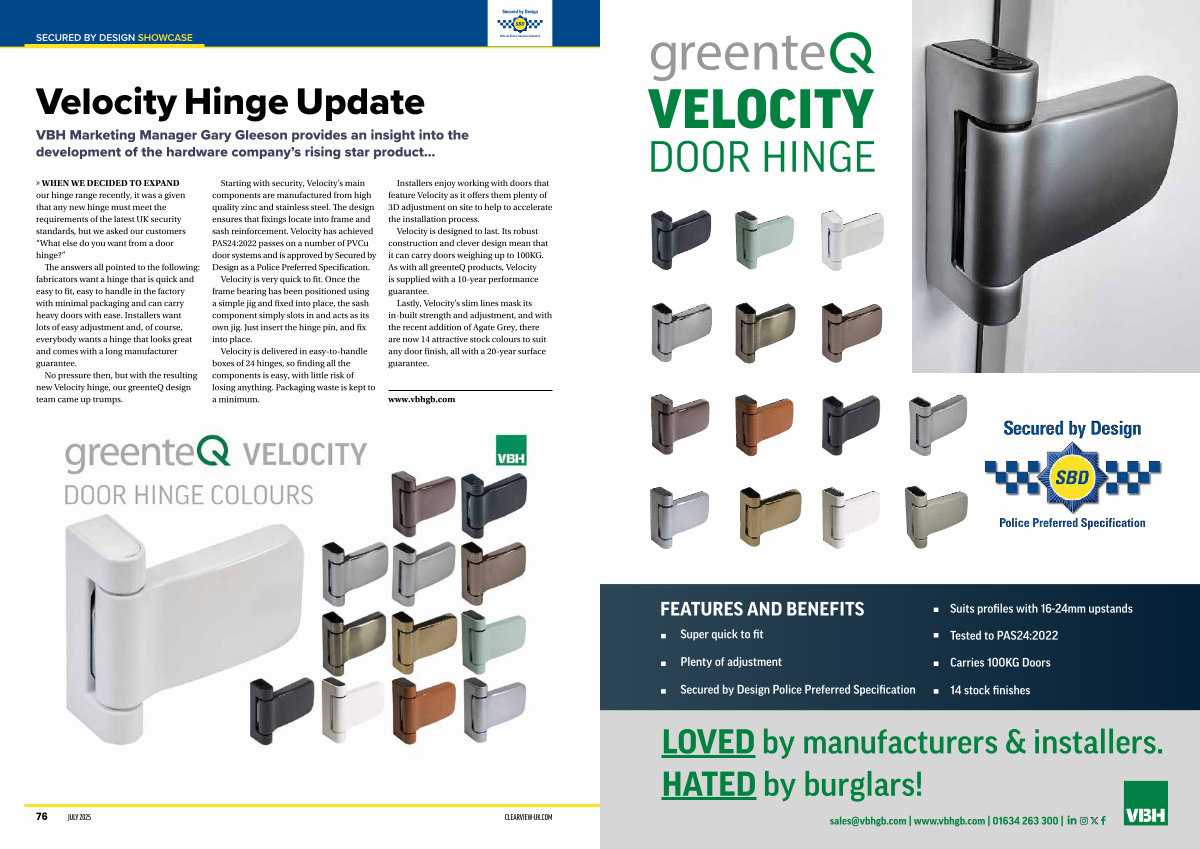 Lastly, Velocity’ s slim lines mask its in-built strength and adjustment, and with the recent addition of Agate Grey, there are now 14 attractive stock colours to suit any door finish, all with a 20-year surface guarantee.