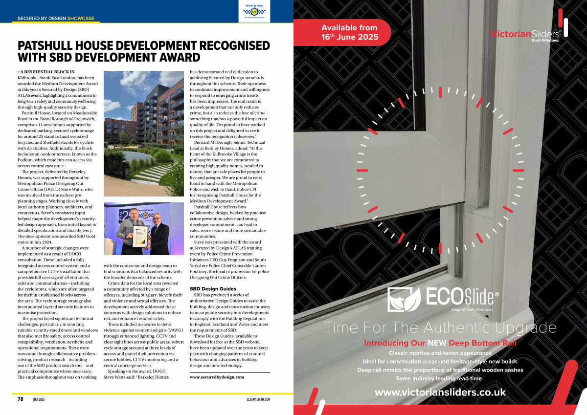 The project, delivered by Berkeley Homes, was supported throughout by Metropolitan Police Designing Out Crime Officer( DOCO) Steve Watts, who was involved from the earliest preplanning stages. Working closely with local authority planners, architects, and contractors, Steve’ s consistent input helped shape the development’ s securityled design approach, from initial layout to detailed specification and final delivery. The development was awarded SBD Gold status in July 2024.