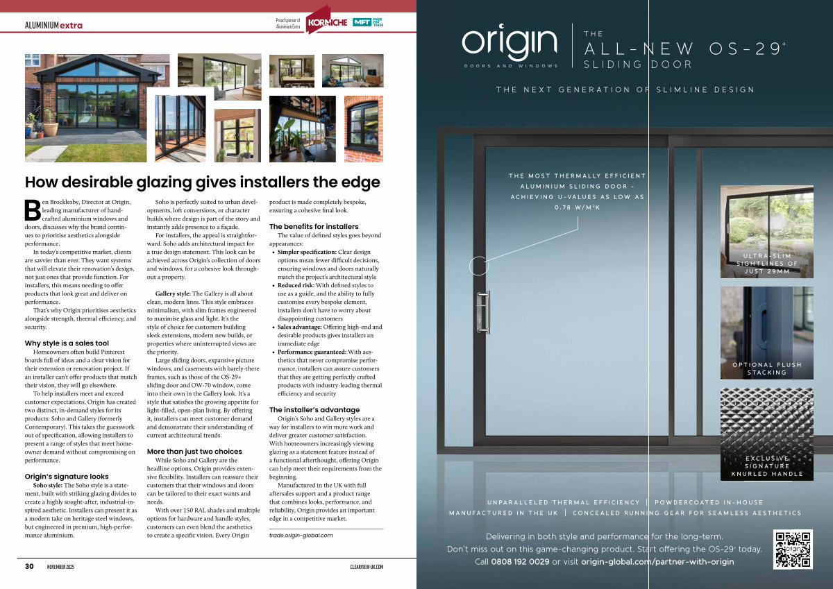 Origin’ s Soho and Gallery styles are a way for installers to win more work and deliver greater customer satisfaction. With homeowners increasingly viewing glazing as a statement feature instead of a functional afterthought, offering Origin can help meet their requirements from the beginning.