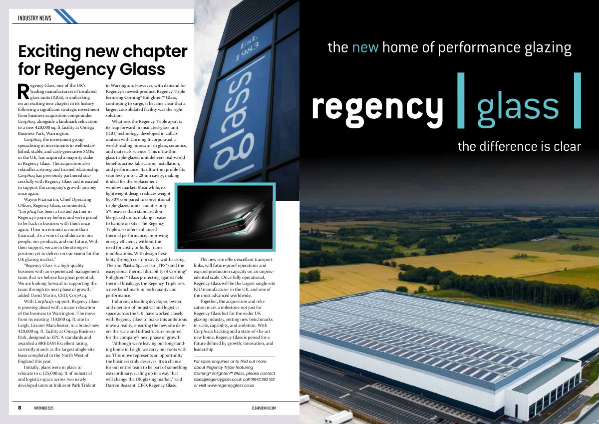 Together, the acquisition and relocation mark a milestone not just for Regency Glass but for the wider UK glazing industry, setting new benchmarks in scale, capability, and ambition. With CorpAcq’ s backing and a state-of-the-art new home, Regency Glass is poised for a future defined by growth, innovation, and leadership.