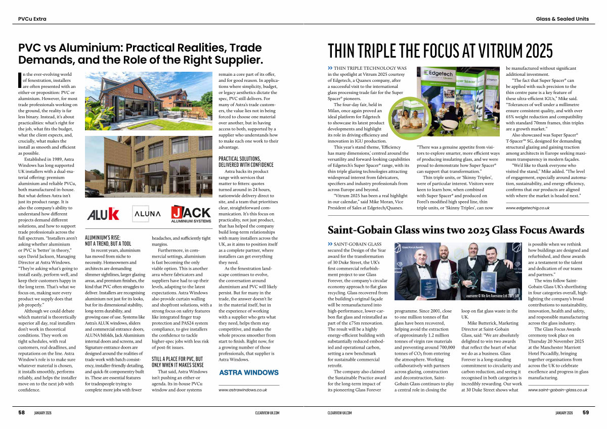 In the ever-evolving world of fenestration, installers are often presented with an either-or proposition: PVC or aluminium. However, for most trade professionals working on the ground, the reality is far less binary. Instead, it’ s about practicalities: what’ s right for the job, what fits the budget, what the client expects, and, crucially, what makes the install as smooth and efficient as possible. Established in 1989, Astra Windows has long supported UK installers with a dual-material offering: premium aluminium and reliable PVCu, both manufactured in-house. But what defines Astra isn’ t just its product range. It is also the company’ s ability to understand how different projects demand different solutions, and how to support trade professionals across the full spectrum.“ Installers aren’ t asking whether aluminium or PVC is‘ better’ in theory,” says David Jackson, Managing Director at Astra Windows.“ They’ re asking what’ s going to install easily, perform well, and keep their customers happy in the long term. That’ s what we focus on, making sure every product we supply does that job properly.”