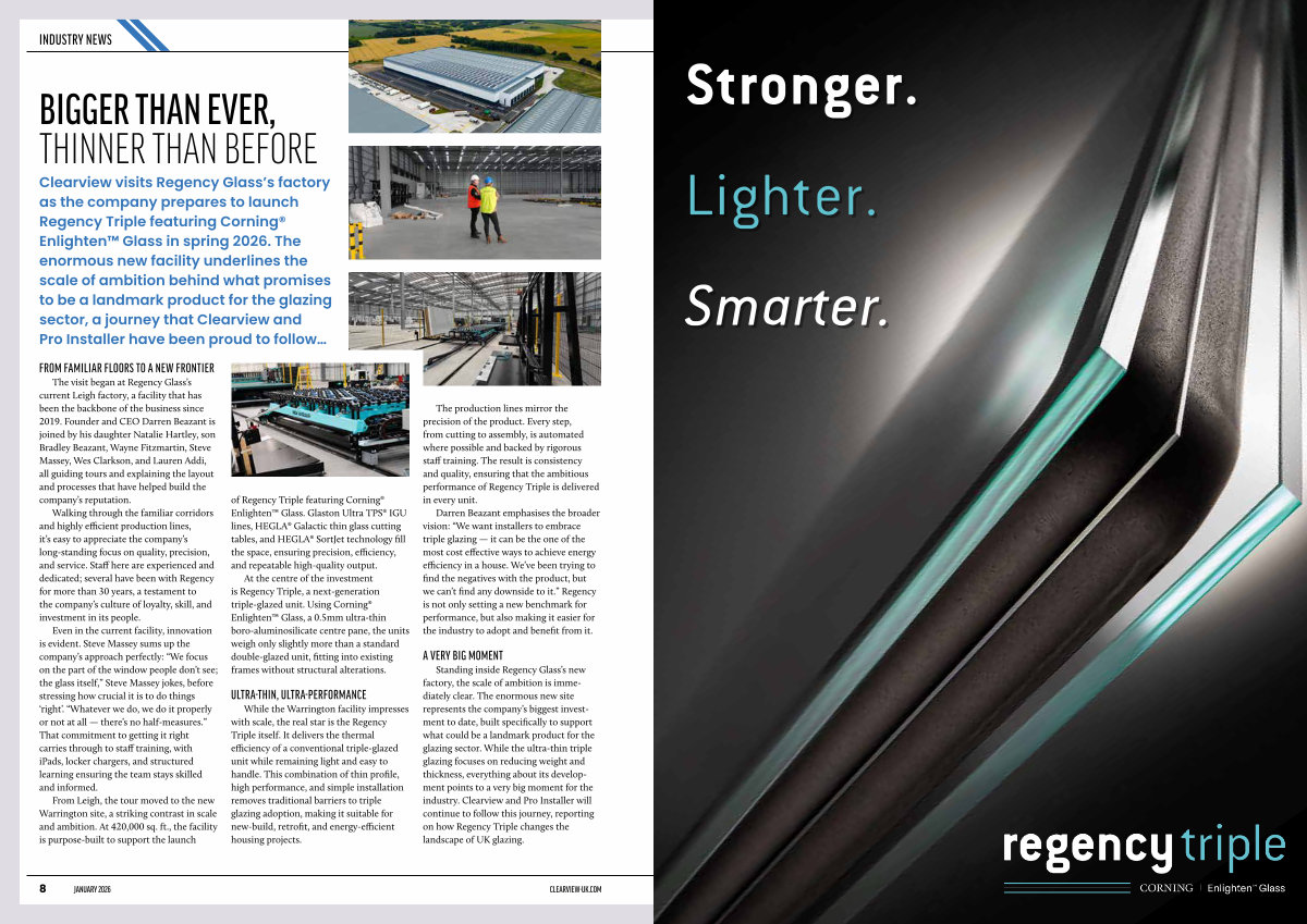 Standing inside Regency Glass’ s new factory, the scale of ambition is immediately clear. The enormous new site represents the company’ s biggest investment to date, built specifically to support what could be a landmark product for the glazing sector. While the ultra-thin triple glazing focuses on reducing weight and thickness, everything about its development points to a very big moment for the industry. Clearview and Pro Installer will continue to follow this journey, reporting on how Regency Triple changes the landscape of UK glazing.