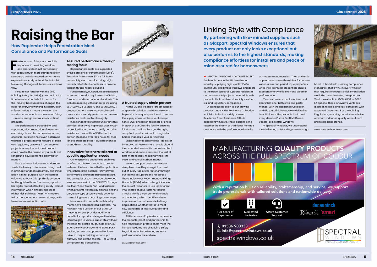 Fasteners and fixings are crucially important in providing windows and doors which not only comply with today’ s much more stringent safety standards, but also exceed performance expectations. Andy Holland, Technical & Marketing Manager at Rapierstar, explains why.