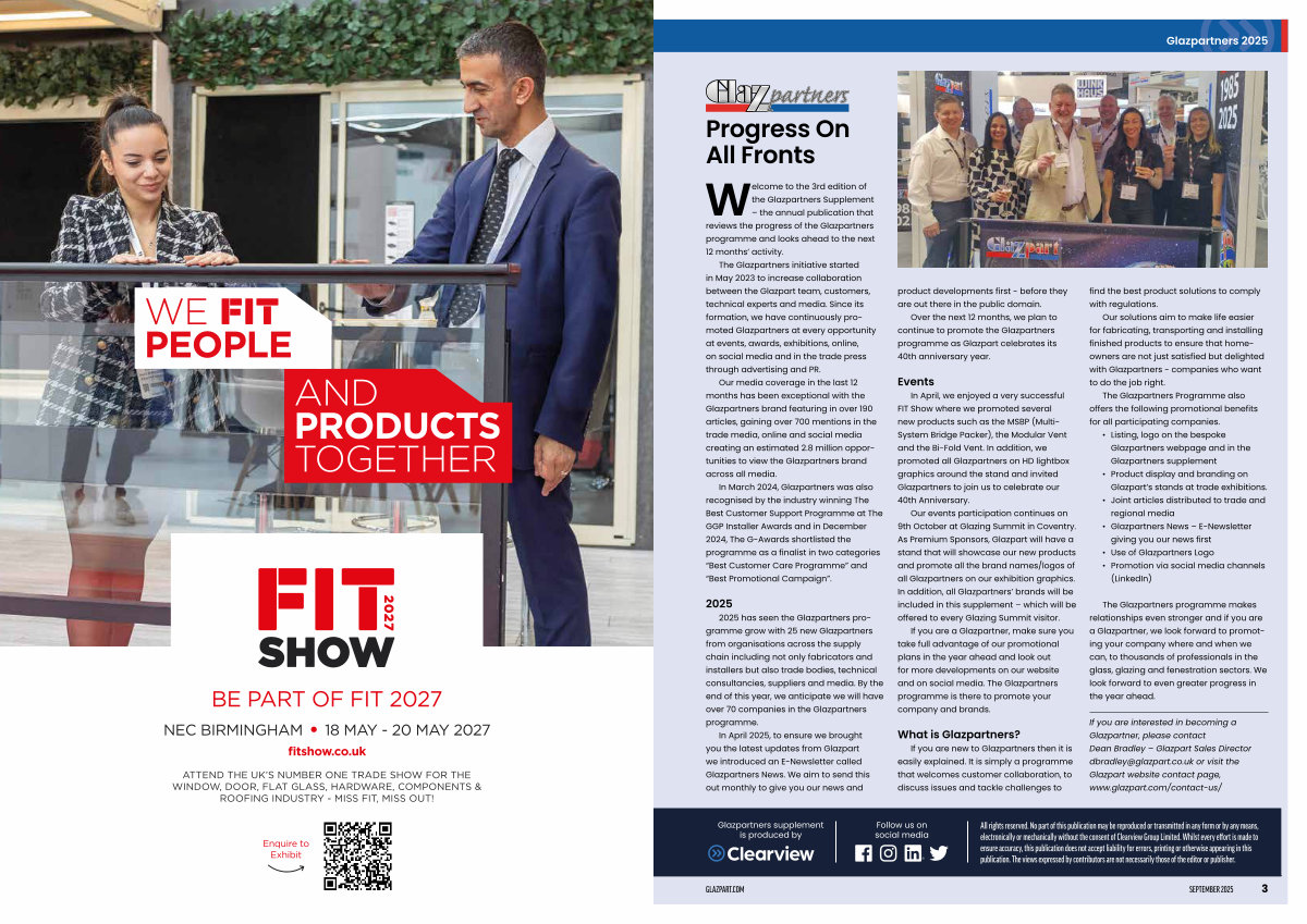 The Glazpartners programme makes relationships even stronger and if you are a Glazpartner, we look forward to promoting your company where and when we can, to thousands of professionals in the glass, glazing and fenestration sectors. We look forward to even greater progress in the year ahead.
