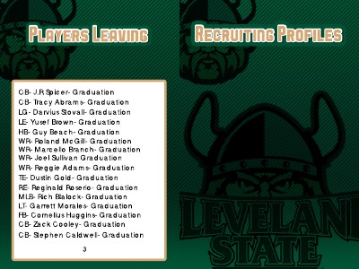 WR- Reggie Adams- Graduation TE- Dustin Gold- Graduation RE- Reginald Roserio- Graduation MLB- Rich Blalock- Graduation LT- Garrett Morales- Graduation FB- Cornelius Huggins- Graduation CB- Zack Cooley- Graduation CB- Stephen Caldwell- Graduation