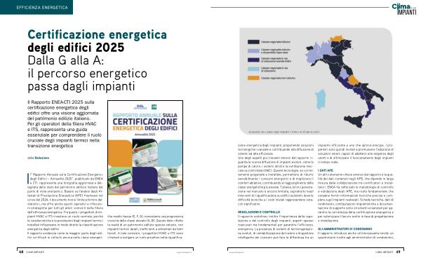REGOLAZIONE E CONTROLLO Il rapporto sottolinea inoltre l’ importanza della regolazione e del controllo degli impianti, aspetti spesso trascurati ma fondamentali per garantire l’ efficienza energetica. La presenza di sistemi di termoregolazione evoluti, di contabilizzazione del calore e di gestione intelligente dei consumi può fare la differenza tra un impianto efficiente e uno che spreca energia. I progettisti sono quindi invitati a promuovere l’ adozione di soluzioni smart, capaci di adattarsi alle esigenze degli utenti e di ottimizzare il funzionamento degli impianti in tempo reale.