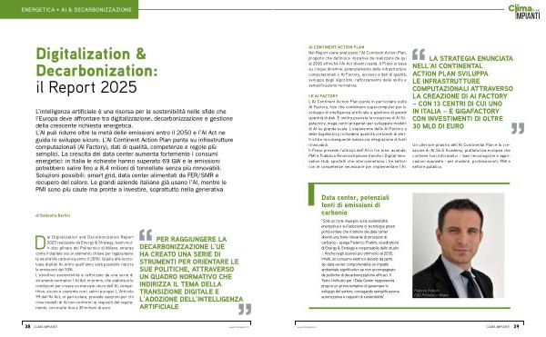 LE AI FACTORY L’ AI Continent Action Plan punta in particolare sulle AI Factory, hub che combinano supercomputer per lo sviluppo di intelligenza artificiale e gestione di grandi quantità di dati. È inoltre prevista la creazione di AI Gigafactory, mega centri progettati per sviluppare modelli di AI su grande scala. L’ espansione delle AI Factory e delle Gigafactory richiederà quantità crescenti di elettricità e la conseguente massiccia integrazione di fonti rinnovabili. Il Piano prevede l’ utilizzo dell’ AI in tre aree: aziende, PMI e Pubblica Amministrazione tramite i Digital Innovation Hub, sportelli che interconnettono i tre settori con le competenze necessarie per implementare l’ AI.