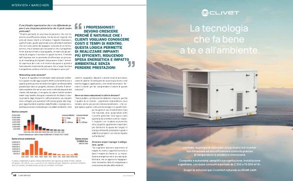 Networking come necessità?“ Il gioco di squadra è essenziale, basti pensare soltanto a quanto incide oggi la parte elettrica ed elettronica e quanto questo porta a sfruttare le migliori professionalità possibili per dare un progetto, diciamo, di livello. È altrettanto evidente che serve una certa ricettività da parte del cliente. Ad esempio, il recupero di calore tramite sistemi water loop( anello d’ acqua) consente di sfruttare il calore prodotto dagli impianti in raffrescamento: più impianti sono collegati, più aumenta l’ efficienza grazie alle maggiori opportunità di scambio caldo / freddo. L’ energia recuperata può essere utilizzata per riscaldare ambienti come
