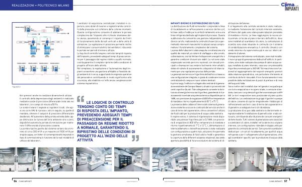 IMPIANTI IDRONICI E DISTRIBUZIONE DEI FLUIDI La distribuzione dei fluidi termovettori comprende le linee di riscaldamento e raffrescamento a servizio dei fan coil, le linee caldo e freddo per le unità di trattamento aria e una linea refrigerata dedicata agli impianti di processo. Questa suddivisione ha consentito una gestione indipendente dei diversi carichi, migliorando la continuità di esercizio e permettendo interventi manutentivi localizzati senza compromettere il funzionamento complessivo del sistema. La posa delle tubazioni è stata eseguita con attenzione alla qualità dei materiali, ai sistemi di staffaggio e alla corretta coibentazione, così da limitare le dispersioni energetiche e garantire condizioni di esercizio stabili. Le reti sono state organizzate secondo percorsi razionali, con dorsali principali e diramazioni secondarie facilmente intercettabili, dotate di valvole di sezionamento e dispositivi di bilanciamento per una regolazione precisa delle portate. La generazione termica e frigorifera dell’ edificio si basa su una configurazione integrata, in grado di combinare risorse centralizzate di campus e nuovi sistemi dedicati. In primo luogo, l’ edificio è collegato alla centrale di trigenerazione esistente del Campus Bassini, situata in prossimità del centro sportivo Giurati. Tale collegamento consente la fornitura sia di energia termica sia frigorifera, garantendo in funzionamento invernale una potenza termica disponibile pari a 1 MW, con pressione di erogazione di 800 kPa e temperature di mandata e ritorno rispettivamente di 85 ° C e 75 ° C. La presenza delle caldaie all’ interno del sistema di generazione esistente assicura la continuità del servizio anche in caso di fermo del cogeneratore, oltre a consentire l’ utilizzo dei fluidi caldi per la produzione di acqua calda sanitaria. In regime estivo, il sistema di trigenerazione rende disponibile una potenza frigorifera pari a 0,7 MW, con pressione di erogazione di 800 kPa e temperature di mandata e ritorno rispettivamente di 7 ° C e 12 ° C. L’ alimentazione di teleriscaldamento e teleraffrescamento è stata realizzata con configurazione a quattro tubi, soluzione che permette la gestione simultanea di fluidi caldi e freddi e garantisce la copertura delle differenti esigenze stagionali, lasciando aperta la possibilità di future evoluzioni del sistema di distribuzione dell’ ateneo. Il collegamento alla centrale esistente è stato realizzato mediante l’ estensione del cunicolo interrato esistente, all’ interno del quale sono state posate tubazioni preisolate di mandata e ritorno. Le linee raggiungono la nuova sottocentrale collocata al piano interrato dell’ edificio, dove sono installati gli scambiatori di calore. Le sottostazioni di scambio sono state integrate in continuità con il sistema di contabilizzazione energetica, il controllo climatico con sonda esterna e la supervisione già in uso sul teleriscaldamento di ateneo. A integrazione del sistema centralizzato, sono stati installati nuovi gruppi di generazione dedicati all’ edificio. In particolare, sono state realizzate due pompe di calore acqua-acqua, installate al piano interrato, ciascuna con potenzialità frigorifera nominale pari a 340 kW. Tali macchine sono funzionali al raggiungimento dei requisiti energetici previsti dalla relazione specialistica, con particolare riferimento al contributo da fonti rinnovabili. Il loro funzionamento è reso possibile dalla realizzazione di pozzi di prelievo e di resa dell’ acqua di falda. Sono inoltre stati installati due refrigeratori acqua / acqua con torre evaporativa e recupero totale, in versione silenziata, ciascuno con potenza frigorifera nominale pari a 699 kW. Le torri evaporative sono posizionate al piano quinto dell’ edificio. La combinazione tra gruppi frigoriferi e pompe di calore consente di coprire integralmente i fabbisogni di raffrescamento anche in caso di fermo del cogeneratore e di garantire un adeguato livello di ridondanza. La produzione di acqua calda sanitaria è ulteriormente integrata mediante l’ installazione di pannelli solari a tubi sottovuoto, contribuendo alla riduzione dei consumi energetici da fonte fossile. Tutti i sistemi di generazione sono associati a scambiatori di calore, installati nel locale tecnico al piano interrato, con configurazione ridondata in doppia unità per garantire la continuità dei servizi. Sono previsti scambiatori dedicati per i circuiti di riscaldamento, per quelli di acqua refrigerata e per il collegamento alla trigenerazione, oltre agli scambiatori specifici per la produzione di acqua calda sanitaria.