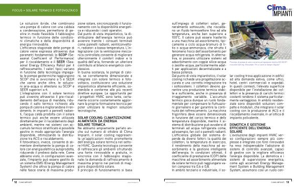 SOLAR COOLING: CLIMATIZZAZIONE ALIMENTATA DA ENERGIA SOLARE TERMICA Ne abbiamo ampiamente parlato anche sul numero di ottobre di Clima Impianti, il solar cooling rappresenta un’ applicazioni molto promettente dell’ energia solare termica nel settore HVAC. Questa tecnologia consente di raffrescare gli ambienti sfruttando una fonte rinnovabile e gratuita, in sincronia con il fabbisogno stagionale: la domanda di raffrescamento è massima proprio nei periodi di maggiore disponibilità solare. Il principio di funzionamento si basa