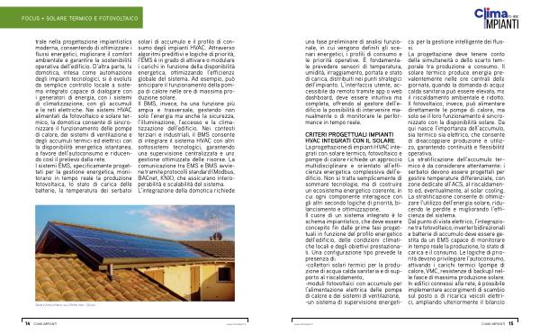 CRITERI PROGETTUALI IMPIANTI HVAC INTEGRATI CON IL SOLARE La progettazione di impianti HVAC integrati con solare termico, fotovoltaico e pompe di calore richiede un approccio multidisciplinare e orientato all’ efficienza energetica complessiva dell’ e- dificio. Non si tratta semplicemente di sommare tecnologie, ma di costruire un ecosistema energetico coerente, in cui ogni componente interagisce con gli altri secondo logiche di priorità, bilanciamento e ottimizzazione. Il cuore di un sistema integrato è lo schema impiantistico, che deve essere concepito fin dalle prime fasi progettuali in funzione del profilo energetico dell’ edificio, delle condizioni climatiche locali e degli obiettivi prestazionali. Una configurazione tipo prevede la presenza di:-collettori solari termici per la produzione di acqua calda sanitaria e di supporto al riscaldamento,-moduli fotovoltaici con accumulo per l’ alimentazione elettrica delle pompe di calore e dei sistemi di ventilazione,-un sistema di supervisione energetica per la gestione intelligente dei flussi. La progettazione deve tenere conto della simultaneità o dello scarto temporale tra produzione e consumo. Il solare termico produce energia prevalentemente nelle ore centrali della giornata, quando la domanda di acqua calda sanitaria può essere elevata, ma il riscaldamento ambientale è ridotto. Il fotovoltaico, invece, può alimentare direttamente le pompe di calore, ma solo se il loro funzionamento è sincronizzato con la disponibilità solare. Da qui nasce l’ importanza dell’ accumulo, sia termico sia elettrico, che consente di disaccoppiare produzione e utilizzo, garantendo continuità e flessibilità operativa. La stratificazione dell’ accumulo termico è da considerare attentamente: i serbatoi devono essere progettati per gestire temperature differenziate, con zone dedicate all’ ACS, al riscaldamento ed, eventualmente, al solar cooling. La stratificazione consente di ottimizzare l’ utilizzo dell’ energia solare, riducendo le perdite e migliorando l’ efficienza del sistema. Dal punto di vista elettrico, l’ integrazione tra fotovoltaico, inverter bidirezionali e batterie di accumulo deve essere gestita da un EMS capace di monitorare in tempo reale la produzione, lo stato di carica e il consumo. Le logiche di priorità devono privilegiare l’ autoconsumo, attivando i carichi termici( pompe di calore, VMC, resistenze di backup) nelle fasce di massima produzione solare. In edifici connessi alla rete, è possibile implementare accorgimenti di scambio sul posto o di ricarica veicoli elettrici, ampliando ulteriormente il bilancio