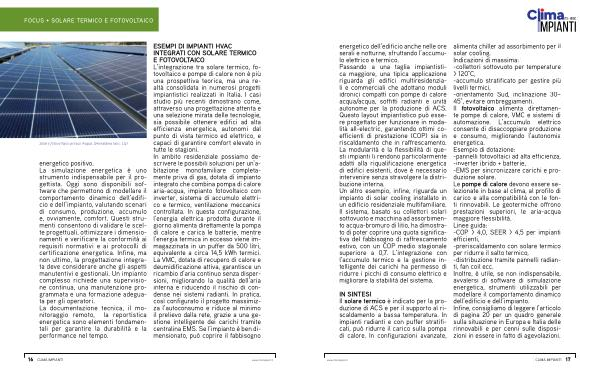 IN SINTESI Il solare termico è indicato per la produzione di ACS e per il supporto al riscaldamento a bassa temperatura. In impianti radianti e con puffer stratificati, può ridurre il carico sulla pompa di calore. In configurazioni avanzate, alimenta chiller ad assorbimento per il solar cooling. Indicazioni di massima:-collettori sottovuoto per temperature > 120 ° C,-accumulo stratificato per gestire più livelli termici,-orientamento Sud, inclinazione 30 – 45 °, evitare ombreggiamenti. Il fotovoltaico alimenta direttamente pompe di calore, VMC e sistemi di automazione. L’ accumulo elettrico consente di disaccoppiare produzione e consumo, migliorando l’ autonomia energetica. Esempio di dotazione:-pannelli fotovoltaici ad alta efficienza,-inverter ibrido + batterie,-EMS per sincronizzare carichi e produzione solare. Le pompe di calore devono essere selezionate in base al clima, al profilo di carico e alla compatibilità con le fonti rinnovabili. Le geotermiche offrono prestazioni superiori, le aria-acqua maggiore flessibilità. Linee guida:-COP > 4,0, SEER > 4,5 per impianti efficienti,-preriscaldamento con solare termico per ridurre il salto termico,-distribuzione tramite pannelli radianti, fan coil ecc. Inoltre, è utile, se non indispensabile, avvalersi di software di simulazione energetica, strumenti utilizzabili per modellare il comportamento dinamico dell’ edificio e dell’ impianto. Infine, consigliamo di leggere l’ articolo di pagina 20 per un quadro generale sulla situazione in Europa e Italia delle rinnovabili e per cenni sulle disposizioni in essere in fatto di agevolazioni.