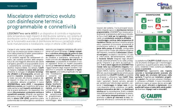 L’ acqua è una risorsa vitale e insostituibile, ma la sua sicurezza può essere messa a rischio dalla presenza di batteri potenzialmente pericolosi, come la Legionella. In un contesto segnato dai cambiamenti climatici, dal costante aumento delle temperature e da una maggiore attenzione alla salute e all’ igiene, garantire un’ acqua potabile sicura e costantemente controllata è diventato un obiettivo imprescindibile. Da sempre, Caleffi si impegna a tutelare la salute delle persone attraverso lo sviluppo di soluzioni tecnologiche affidabili e all’ avanguardia, pensate per garantire massima sicurezza e rispondere in modo concreto alle diverse esigenze degli impianti. In linea con la mission e visione aziendale, abbiamo progettato il nuovo LEGIOMIX ® evo serie 6003, il miscelatore elettronico evoluto, per la gestione dell’ acqua calda sanitaria negli impianti centralizzati, anche di grandi dimensioni. Un dispositivo che unisce alte prestazioni, protezione continua e connettività avanzata, offrendo una gestione efficiente e sicura del comfort idrico. Realizzato in ottone LOW LEAD, garantisce piena conformità alle normative igienico-sanitarie e assicura una maggiore resistenza alla corrosione e all’ usura nel tempo. Il design compatto e la struttura ottimizzata dal punto di vista energetico rendono LEGIOMIX ® evo semplice da installare e mantenere, contribuendo in modo concreto alla riduzione dei costi di manutenzione. La possibilità di installare il nuovo regolatore anche sui modelli precedenti facilita gli interventi di retrofit, semplificando l’ aggiornamento degli impianti esistenti. Il dispositivo è composto da attuatore e regolatore separati, una scelta progettuale che agevola l’ installazione e consente una gestione più flessibile. Il regolatore digitale, dotato di display touchscreen di ultima generazione, garantisce un’ interfaccia intuitiva e immediata, semplificando la programmazione, la gestione e il monitoraggio delle