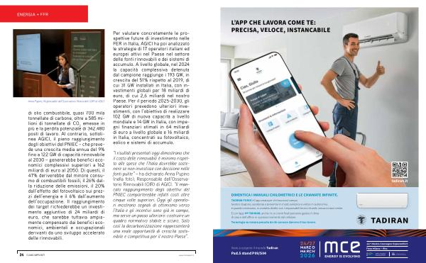 di olio combustibile, quasi 700 mila tonnellate di carbone, oltre a 585 milioni di tonnellate di CO 2 emesse in più e la perdita potenziale di 342.480 posti di lavoro. Al contrario, sottolinea AGICI, il pieno raggiungimento degli obiettivi del PNIEC – che prevede una crescita media annua del 9 % fino a 122 GW di capacità rinnovabile al 2030 – genererebbe benefici economici complessivi superiori a 162 miliardi di euro al 2050. Di questi, il 47 % deriverebbe dal minore consumo di combustibili fossili, il 26 % dalla riduzione delle emissioni, il 20 % dall’ effetto del fotovoltaico sui prezzi dell’ energia e il 6 % dall’ aumento dell’ occupazione. Il raggiungimento dei target richiederebbe un investimento aggiuntivo di 24 miliardi di euro, che sarebbe tuttavia ampiamente compensato dai benefici economici, ambientali e occupazionali derivanti da uno sviluppo accelerato delle rinnovabili.