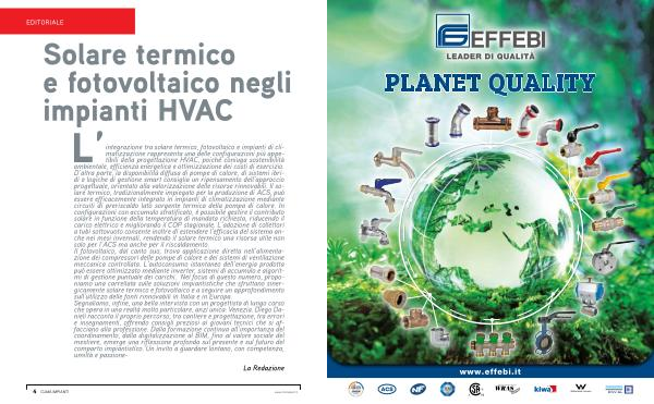 integrazione tra solare termico, fotovoltaico e impianti di climatizzazione rappresenta una delle configurazioni più appetibili della progettazione HVAC, poiché coniuga sostenibilità ambientale, efficienza energetica e ottimizzazione dei costi di esercizio. D’ altra parte, la disponibilità diffusa di pompe di calore, di sistemi ibridi e logiche di gestione smart consiglia un ripensamento dell’ approccio progettuale, orientato alla valorizzazione delle risorse rinnovabili. Il solare termico, tradizionalmente impiegato per la produzione di ACS, può essere efficacemente integrato in impianti di climatizzazione mediante circuiti di preriscaldo lato sorgente termica della pompa di calore. In configurazioni con accumulo stratificato, è possibile gestire il contributo solare in funzione della temperatura di mandata richiesta, riducendo il carico elettrico e migliorando il COP stagionale. L’ adozione di collettori a tubi sottovuoto consente inoltre di estendere l’ efficacia del sistema anche nei mesi invernali, rendendo il solare termico una risorsa utile non solo per l’ ACS ma anche per il riscaldamento. Il fotovoltaico, dal canto suo, trova applicazione diretta nell’ alimentazione dei compressori delle pompe di calore e dei sistemi di ventilazione meccanica controllata. L’ autoconsumo istantaneo dell’ energia prodotta può essere ottimizzato mediante inverter, sistemi di accumulo e algoritmi di gestione puntuale dei carichi. Nel focus di questo numero, proponiamo una carrellata sulle soluzioni impiantistiche che sfruttano sinergicamente solare termico e fotovoltaico e a seguire un approfondimento sull’ utilizzo delle fonti rinnovabili in Italia e in Europa. Segnaliamo, infine, una bella intervista con un progettista di lungo corso che opera in una realtà molto particolare, anzi unica: Venezia. Diego Danieli racconta il proprio percorso, tra cantiere e progettazione, tra errori e insegnamenti, offrendo consigli preziosi ai giovani tecnici che si affacciano alla professione. Dalla formazione continua all’ importanza del coordinamento, dalla digitalizzazione al BIM, fino al valore sociale del mestiere, emerge una riflessione profonda sul presente e sul futuro del comparto impiantistico. Un invito a guardare lontano, con competenza, umiltà e passione-