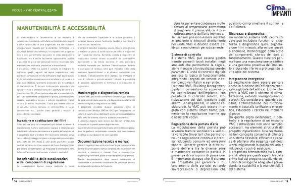 La manutenibilità e l’ accessibilità di un impianto di ventilazione meccanica controllata centralizzata sono aspetti a volte sottovalutati in fase progettuale, ma che rivestono un’ importanza rilevante per la durabilità, l’ efficienza e la sicurezza del sistema nel tempo. Un impianto ben progettato non è solo performante dal punto di vista energetico e funzionale, ma è anche facilmente ispezionabile, pulibile e gestibile da parte del personale tecnico incaricato della manutenzione ordinaria, preventiva e straordinaria. Il progettista HVAC ha quindi il compito di integrare fin dall’ inizio questi requisiti nel layout impiantistico, nella scelta dei componenti e nella definizione degli spazi tecnici. L’ unità di ventilazione deve essere installata in un locale o in uno spazio tecnico facilmente accessibile per le operazioni di manutenzione. È dunque fondamentale prevedere uno spazio frontale e laterale libero per l’ apertura dell’ unità e la rimozione dei filtri, illuminazione adeguata e prese elettriche per l’ uso di strumenti di ispezione e pulizia, pavimentazione lavabile, segnaletica tecnica e schemi impiantistici visibili in loco. In edifici residenziali, l’ unità può essere collocata in un vano tecnico comune, in controsoffitto, in locale seminterrato ecc., purché siano garantiti i requisiti di accessibilità e sicurezza.