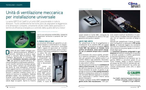 La serie AIR113 di Caleffi è un’ unità VMC posizionabile in tutte le direzioni. Tra le caratteristiche tecniche sono da segnalare la leggerezza e le dimensioni compatte, unitamente all’ alto livello delle prestazioni in termini di efficienza energetica e controllo della qualità dell’ aria indoor