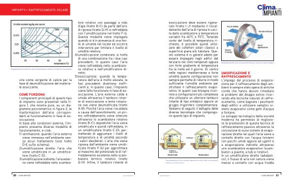 essiccazione deve essere rigenerato( tratto I-J) mediante il riscaldamento dell’ aria di ripresa in uscita dallo scambiatore a temperature variabili fra 40 ° C e 70 ° C. Tenendo conto del livello di temperatura richiesto, è possibile quindi utilizzare dei collettori solari classici a superficie piana e / o tubolare. Questo sistema è in genere adatto per essere impiegato negli edifici del terziario nei climi temperati oppure con forte gradiente di temperatura fra la notte ed il giorno. Di contro nelle regioni mediterranee a forte umidità questa configurazione non sempre permette di ridurre in modo sufficiente l’ umidità ambiente per sfruttare il raffrescamento evaporativo. In questi casi bisogna ricorrere a configurazioni più complesse che utilizzano un ulteriore tamburo rotante di tipo entalpico oppure un gruppo frigorifero complementare. Vediamo di seguito il dettaglio delle diverse tecnologie che compongono questo tipo di impianto.