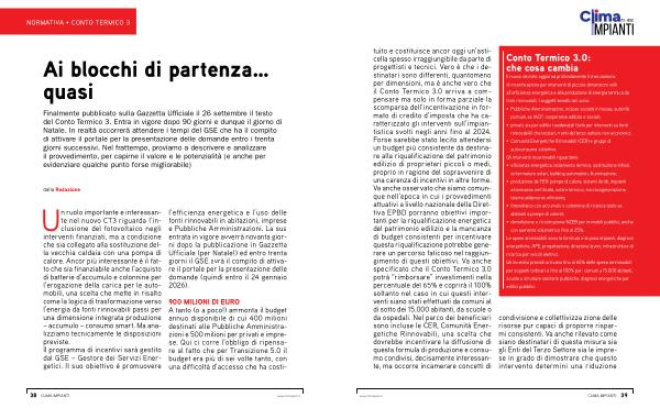 its • hvac tuito e costituisce ancor oggi un’ asticella spesso irraggiungibile da parte di progettisti e tecnici. Vero è che i destinatari sono differenti, quantomeno per dimensioni, ma è anche vero che il Conto Termico 3.0 arriva a compensare ma solo in forma parziale la scomparsa dell’ incentivazione in formato di credito d’ imposta che ha caratterizzato gli interventi sull’ impiantistica svolti negli anni fino al 2024. Forse sarebbe stato lecito attendersi un budget più consistente da destinare alla riqualificazione del patrimonio edilizio di proprietari piccoli o medi, proprio in ragione del sopravvenire di una carenza di incentivi in altre forme. Va anche osservato che siamo comunque nell’ epoca in cui i provvedimenti attuativi a livello nazionale della Direttiva EPBD porranno obiettivi importanti per la riqualificazione energetica del patrimonio edilizio e la mancanza di budget consistenti per incentivare questa riqualificazione potrebbe generare un percorso faticoso nel raggiungimento di questi obiettivi. Va anche specificato che il Conto Termico 3.0 potrà“ rimborsare” investimenti nella percentuale del 65 % e coprirà il 100 % soltanto nel caso in cui questi interventi siano stati effettuati da comuni al di sotto dei 15.000 abitanti, da scuole o da ospedali. Nel parco dei beneficiari sono incluse le CER, Comunità Energetiche Rinnovabili, una scelta che dovrebbe incentivare la diffusione di questa formula di produzione e consumo condivisi, decisamente interessante, ma occorre incamerare concetti di