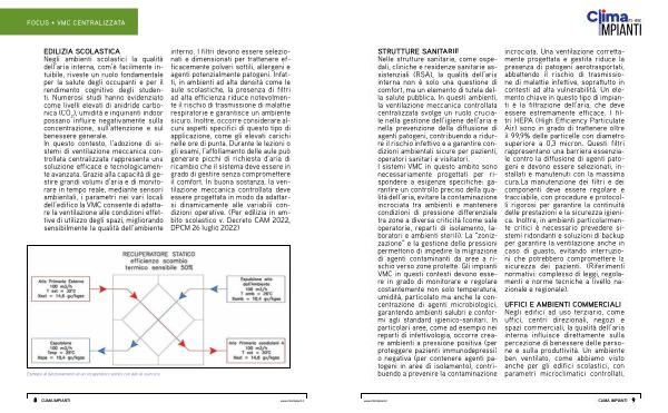 ), umidità e inquinanti indoor possano influire negativamente sulla concentrazione, sull’ attenzione e sul benessere generale. In questo contesto, l’ adozione di sistemi di ventilazione meccanica controllata centralizzata rappresenta una soluzione efficace e tecnologicamente avanzata. Grazie alla capacità di gestire grandi volumi d’ aria e di monitorare in tempo reale, mediante sensori ambientali, i parametri nei vari locali dell’ edifico la VMC consente di adattare la ventilazione alle condizioni effettive di utilizzo degli spazi, migliorando sensibilmente la qualità dell’ ambiente interno. I filtri devono essere selezionati e dimensionati per trattenere efficacemente polveri sottili, allergeni e agenti potenzialmente patogeni. Infatti, in ambienti ad alta densità come le aule scolastiche, la presenza di filtri ad alta efficienza riduce notevolmente il rischio di trasmissione di malattie respiratorie e garantisce un ambiente sicuro. Inoltre, occorre considerare alcuni aspetti specifici di questo tipo di applicazione, come gli elevati carichi nelle ore di punta. Durante le lezioni o gli esami, l’ affollamento delle aule può generare picchi di richiesta d’ aria di ricambio che il sistema deve essere in grado di gestire senza compromettere il comfort. In buona sostanza, la ventilazione meccanica controllata deve essere progettata in modo da adattarsi dinamicamente alle variabili condizioni operative.( Per edilizia in ambito scolastico v. Decreto CAM 2022, DPCM 26 luglio 2022)