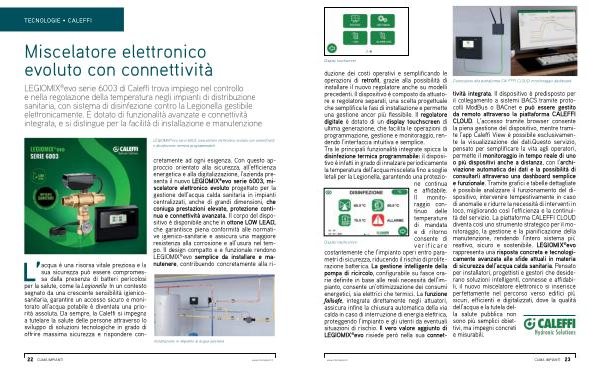 sua sicurezza può essere compromessa dalla presenza di batteri pericolosi per la salute, come la Legionella. In un contesto segnato da una crescente sensibilità igienicosanitaria, garantire un accesso sicuro e monitorato all’ acqua potabile è diventata una priorità assoluta. Da sempre, la Caleffi si impegna a tutelare la salute delle persone attraverso lo sviluppo di soluzioni tecnologiche in grado di offrire massima sicurezza e rispondere concretamente ad ogni esigenza. Con questo approccio orientato alla sicurezza, all’ efficienza energetica e alla digitalizzazione, l’ azienda presenta il nuovo LEGIOMIX ® evo serie 6003, miscelatore elettronico evoluto progettato per la gestione dell’ acqua calda sanitaria in impianti centralizzati, anche di grandi dimensioni, che coniuga prestazioni elevate, protezione continua e connettività avanzata. Il corpo del dispositivo è disponibile anche in ottone LOW LEAD, che garantisce piena conformità alle normative igienico-sanitarie e assicura una maggiore resistenza alla corrosione e all’ usura nel tempo. Il design compatto e e funzionale rendono LEGIOMIX ® evo semplice da installare e manutenere, contribuendo concretamente alla ri-