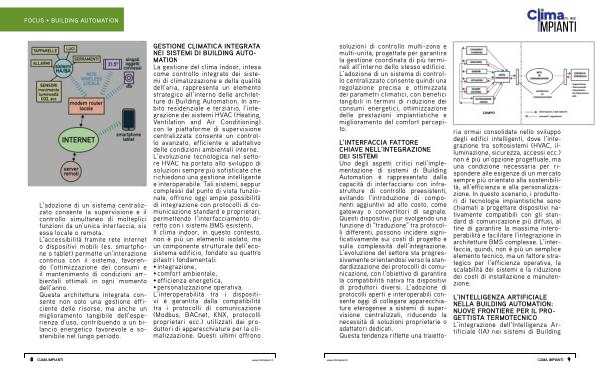 GESTIONE CLIMATICA INTEGRATA NEI SISTEMI DI BUILDING AUTO- MATION La gestione del clima indoor, intesa come controllo integrato dei sistemi di climatizzazione e della qualità dell’ aria, rappresenta un elemento strategico all’ interno delle architetture di Building Automation. In ambito residenziale e terziario, l’ integrazione dei sistemi HVAC( Heating, Ventilation and Air Conditioning) con le piattaforme di supervisione centralizzata consente un controllo avanzato, efficiente e adattativo delle condizioni ambientali interne. L’ evoluzione tecnologica nel settore HVAC ha portato allo sviluppo di soluzioni sempre più sofisticate che richiedono una gestione intelligente e interoperabile. Tali sistemi, seppur complessi dal punto di vista funzionale, offrono oggi ampie possibilità di integrazione con protocolli di comunicazione standard e proprietari, permettendo l’ interfacciamento diretto con i sistemi BMS esistenti. Il clima indoor, in questo contesto, non è più un elemento isolato, ma un componente strutturale dell’ ecosistema edificio, fondato su quattro pilastri fondamentali: