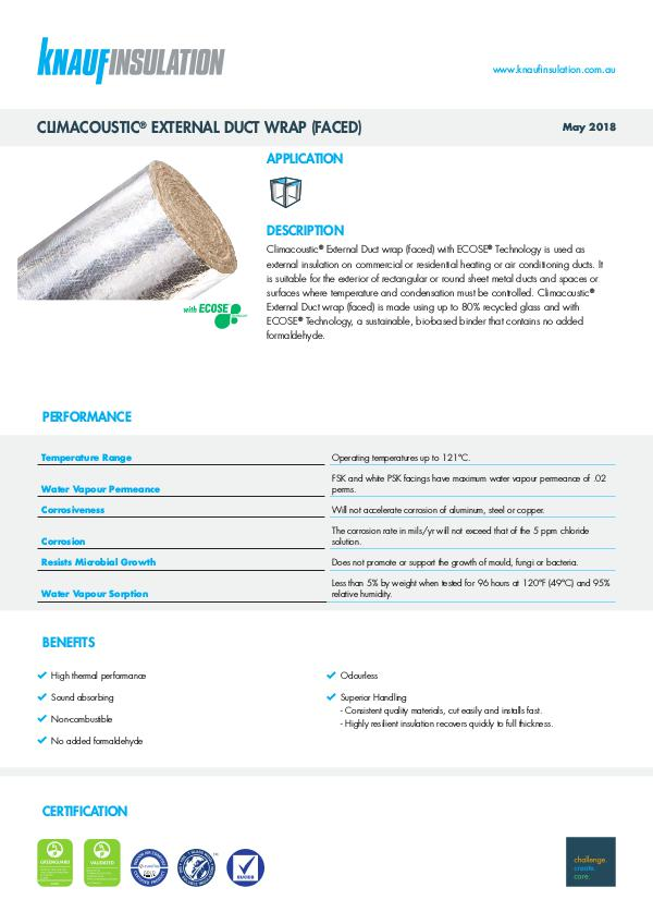 Climacoustic ® External Duct wrap (faced) with ECOSE ® Technology is used as