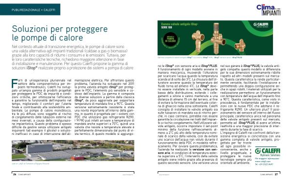 Forti di un’ esperienza pluriennale nel settore della componentistica per impianti termoidraulici, Caleffi ha sviluppato un’ ampia gamma di prodotti progettati per proteggere le PDC da impurità e condizioni critiche, per ottimizzarne l’ efficienza e garantire la funzionalità dell’ impianto nel tempo, migliorando il comfort per l’ utente finale e contribuendo alla sostenibilità ambientale. Le pompe di calore monoblocco, tra le più diffuse, sono soggette al rischio di congelamento delle tubazioni esterne nei mesi invernali, a causa della configurazione impiantistica. Questo problema è spesso difficile da gestire senza utilizzare antigelo inquinanti( ad esempio il glicole) o soluzioni inefficaci in caso di interruzione dell’ alimentazione elettrica. Per affrontare questo problema, l’ azienda ha sviluppato nel 2011 la prima valvola antigelo iStop ® per proteggere le PDC, l’ elemento più sensibile e costoso dell’ impianto. La gamma è composta da diverse soluzioni a partire dalla classica iStop ®, da poco aggiornata per sopportare temperature di mandata fino a 90 ° C. Questa versione estremamente resistente è stata una novità importante all’ interno della gamma, in quanto è progettata per i sistemi con PDC che utilizzano gas refrigerante R290. L’ R290 può infatti arrivare a temperature di mandata anche superiori a 70 ° C, quindi una valvola che resiste a temperature elevate è perfettamente dimensionata dal punto di vista termico. A questo modello si aggiungo-