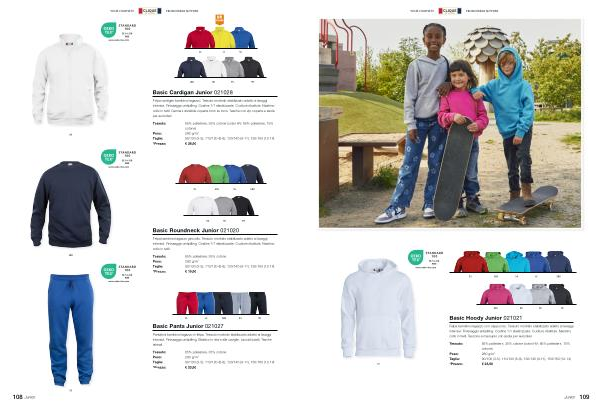 65 % poliestere , 35 % cotone Peso : 280 g / m 2 Taglie : 90 / 100 ( 3-5 ), 110 / 120 ( 6-8 ), 130 / 140 ( 9-11 ), 150 / 160 ( 12-14 ) * Prezzo : € 23,90