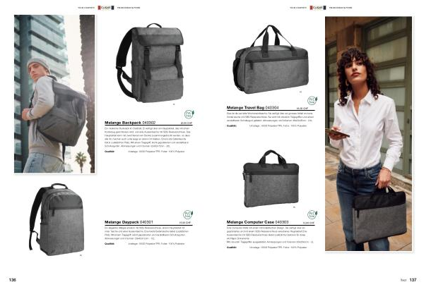 Ein eleganter Alltagsrucksack mit SBS-Reissverschluss, einem Hauptabteil mit inner Tasche und einer Aussentasche. Eine breite Seitentasche bietet zusätzlichen Platz. Mit einem Tragegriff, leicht gepolsterten und verstellbaren Schultergurten. Abmessungen und Volumen: 28x42x12cm- 12L