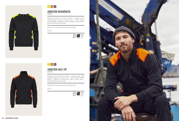 Sweatshirt unisexe 1 / 2 zip contrasté- visibilité accrue. 100 % polyester recyclé au toucher coton- 1 poche latérale cachée zippée- Poignets et ourlets de la taille en tissu côtelé- étiquette facilement amovible