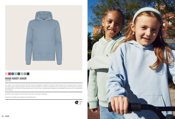 Um casaco com capuz júnior feito de uma mistura de algodão e poliéster reciclado. Capuz forrado com o tecido principal e interior escovado. Bolso canguru grande na frente. Punhos e bainha em malha canelada 2x2 com costura dupla. Fita reforçada no pescoço e etiqueta facilmente removível para rebranding. Tecido macio e estabilizado, adequado para lavagens intensivas, com acabamento anti-borboto.