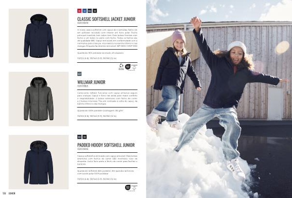Casaco softshell acolchoado com capuz amovível. Dois bolsos exteriores com fechos de correr SBS invertidos. Fácil de etiquetar. Inclui forro preto e fecho de correr para facilitar o bordado.