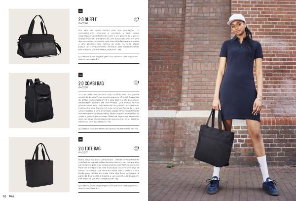 Um saco de treino versátil com boa ventilação. O compartimento principal é ventilado e tem bolsos organizadores com fecho de correr e um gancho para portachaves. Pode ser transportada com duas alças ou com uma alça de ombro removível, com uma almofada para o ombro e uma abertura para cartões de visita. Na parte lateral, possui um compartimento ventilado para sapatos / toalhas. Dimensões e volume: 48x25,5x28,5cm- 34L