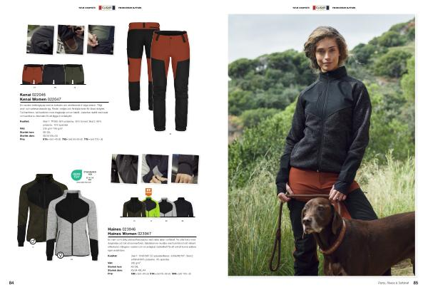 Kvalitet: Skal 1: TP380; 65 % polyester, 35 % bomull. Skal 2: 88 % polyester, 12 % spandex Vikt: 235 g / m 2 185 g / m 2 Storlek herr: