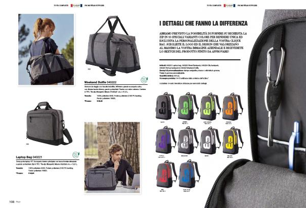 Articoli : 040221 Laptop bag , 040223 Street Backpack , 040224 City backpack , 040220 Roll up backpack & 040222 Weekend Duffle . Esempi di personalizzazione : stampa serigrafica , ricamo o etichetta in gomma . Tirazip in gomma personalizzabile . Quantità minima : 300 pz . Consegna prevista : 14-15 settimane dalla conferma dell ' ordine .*