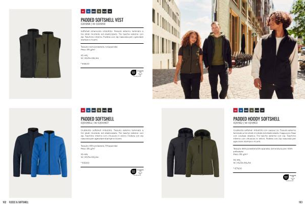 Giubbotto softshell imbottito con cappuccio. Tessuto esterno laminato a tre strati morbido ed elasticizzato. Cappuccio fisso con coulisse elastica. Tre tasche esterne con zip. Taschino interno con chiusura in velcro. Fodera con zip nascosta per agevolare stampe e ricami.