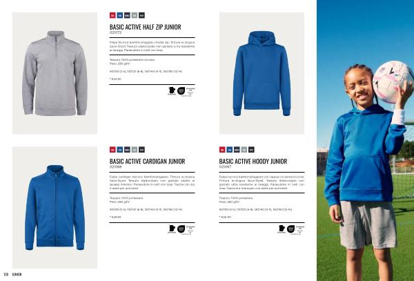 Felpa cardigan tecnica bambino / ragazzo. Tintura ecologica Spun-Dyed. Tessuto elasticizzato non garzato adatto ai lavaggi intensivi. Parasudore in twill con loop. Tasche con zip e asole per auricolari.